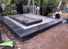 Когда подготовительные работы на территории могилы были завершены, мы принялись за укладку брусчатки на пескобетон, сама плитка была уложена вровень с облицованным гранитными плитами цоколем. Параллельно с этим мы подготовили основание для последующей установки надгробья.